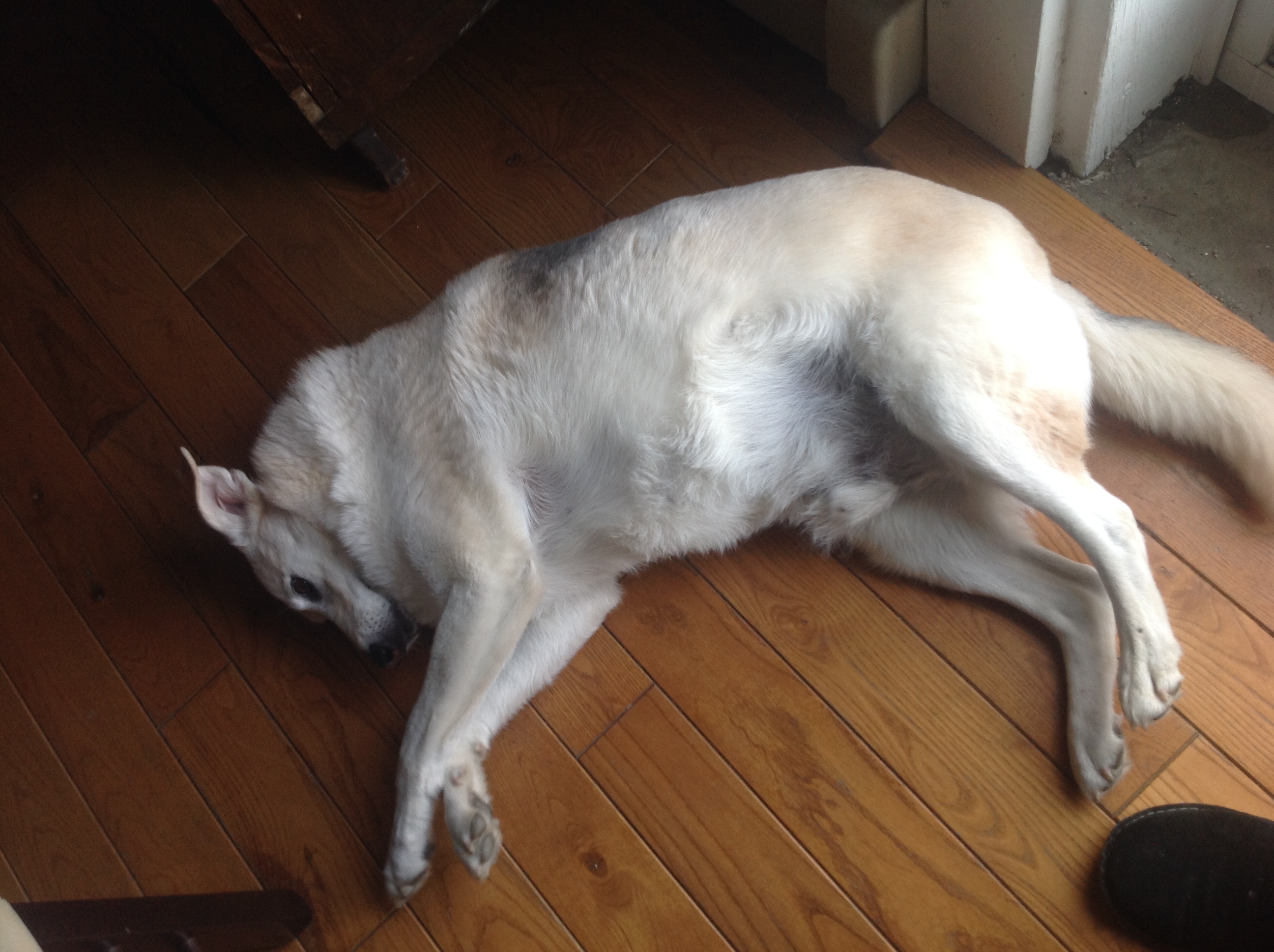Anyway, the dogs usually eat about 4:30p or so.  At about 4:40p, Stout slowly slinked his way into her studio and was like, “hey, uh, just checking to see if, uh, you might want to make us dinner.”  (He is, indeed, all teenage boy.)  So, somehow, he opened the door in the kitchen without an opposable thumb.  If the door had not been closed all the way, he would have been down there bugging her hours before.  So, yeah. We’ll see where this little saga goes…